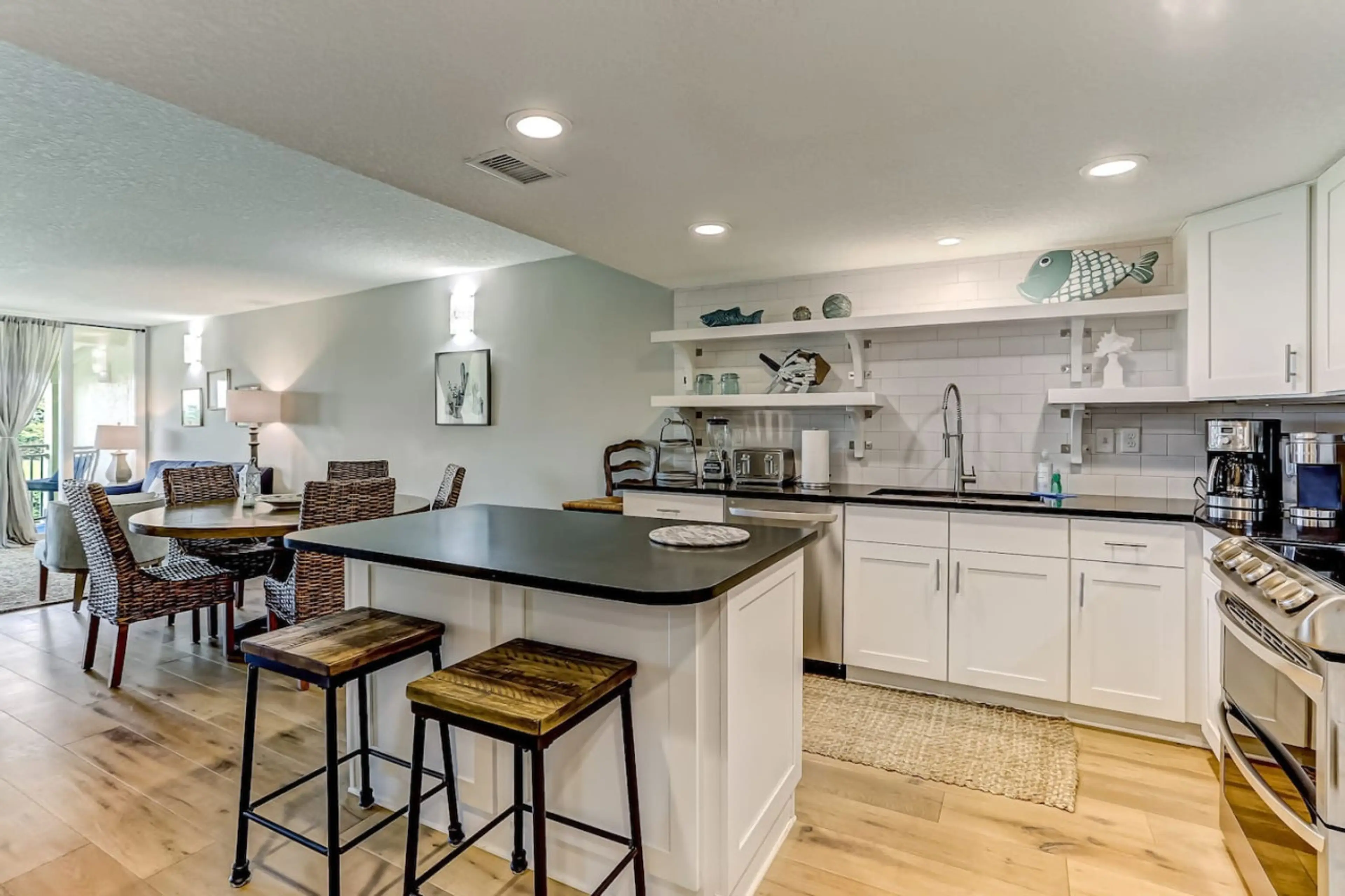 This is a lovely, well-appointed condo in the beautiful Amelia Island plantation property. The kitchen had all needed amenities and had been recently renovated -- it is very high end. The beds were comfortable, and the porch is a lovely place for morning coffee or evening cocktails. There are a lot of steps to the condo (including from the elevator) and from the condo to the pool and then to the beach area, so it may not be ideal for older guests. But the property is fantastic and I would highly recommend it.